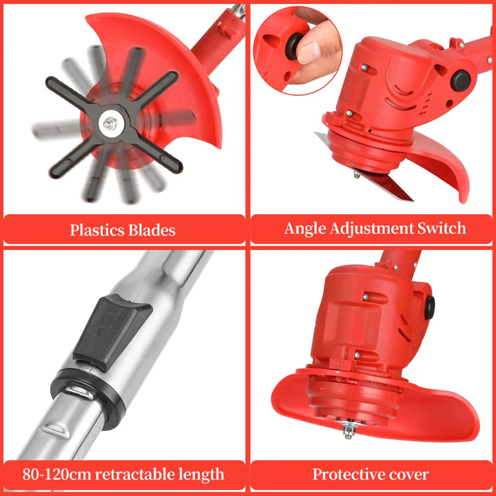 Efikasno košenje i orezivanje – uz 5 plastičnih noževa za travu i 2 metalna sečiva za jaču vegetaciju.