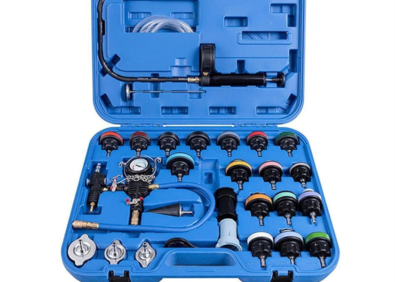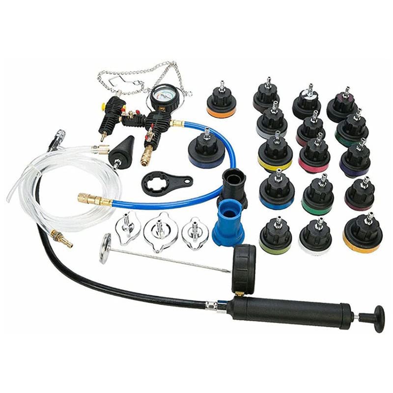 Uz ovaj praktičan set alata možete otkriti unutrašnja curenja motora uzrokovana dihtunzima glave, kao i napuklim blokovima i glavama motora. Ovaj komplet omogućava zamenu rashladne tečnosti i testiranje nepropusnosti rashladnog sistema vozila, uključujući hladnjak, grejač i čep hladnjaka, na jednostavan i precizan način. Alati za vakuumsko čišćenje i ponovno punjenje pomažu pri punjenju rashladnog sistema vozila i uklanjanju vazdušnih džepova. Izrađen od visokokvalitetnih materijala, ovaj set je izuzetno izdržljiv.
