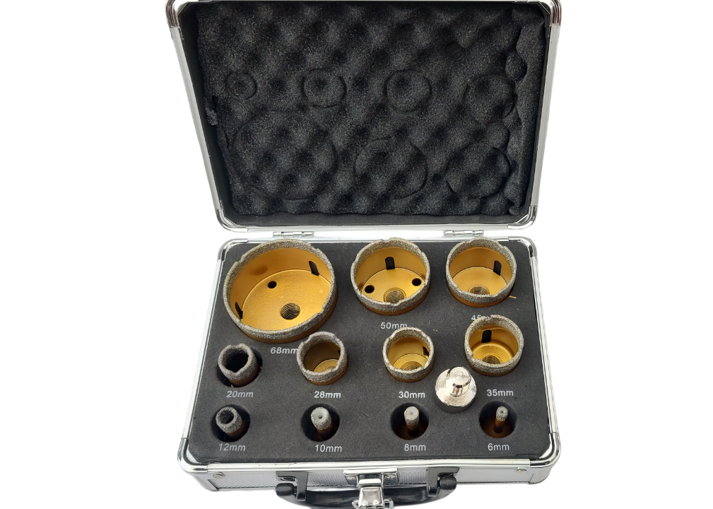 Set od 11 dijamantskih krunica M14 — 6 / 8 / 10 / 12 / 20 / 28 / 30 / 35 / 45 / 50 / 68 mm + adapter za bušilicu.