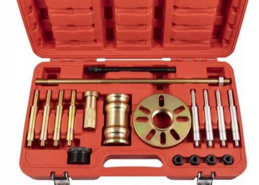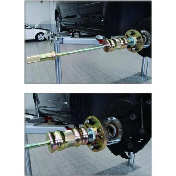 - Višestruki i težak kombinovani komplet za izvlačenje glavčine koji može izvaditi sklopove bubnja / disk / glavčine kada se koristi sa metodom vijčanog sila ili za tvrdoglavo glavčine, može se koristiti metoda kliznog čekića (4,3 kg). Alat se takođe može koristiti za pritisak spojnice pogona / CV-a ako je to neophodno